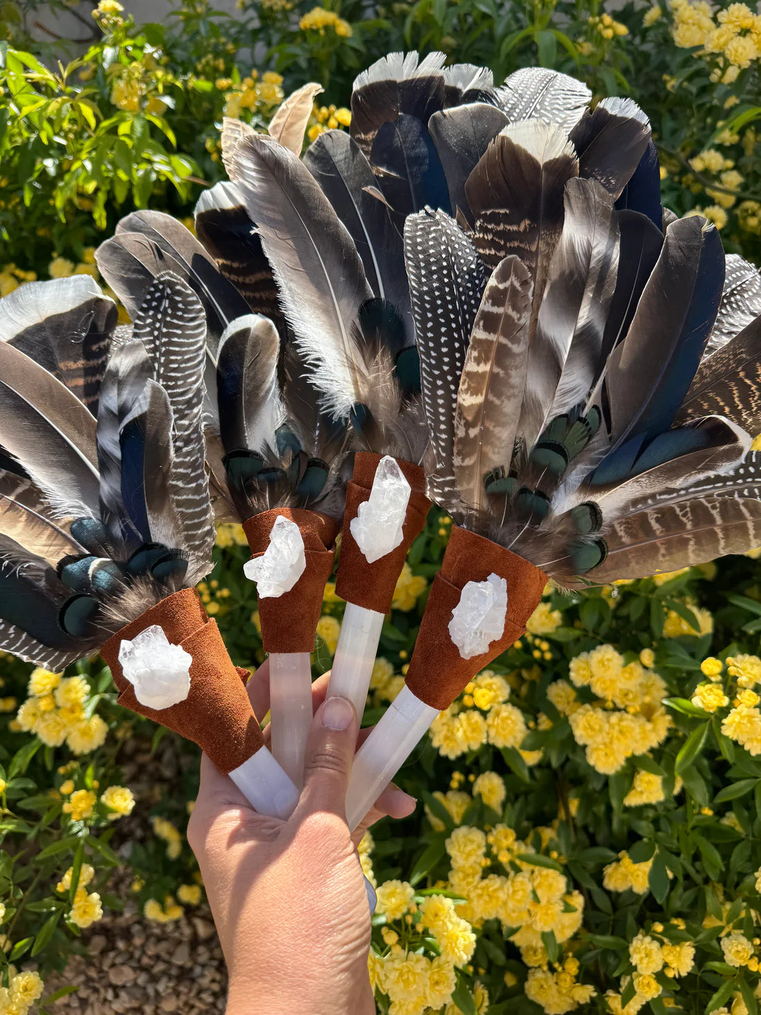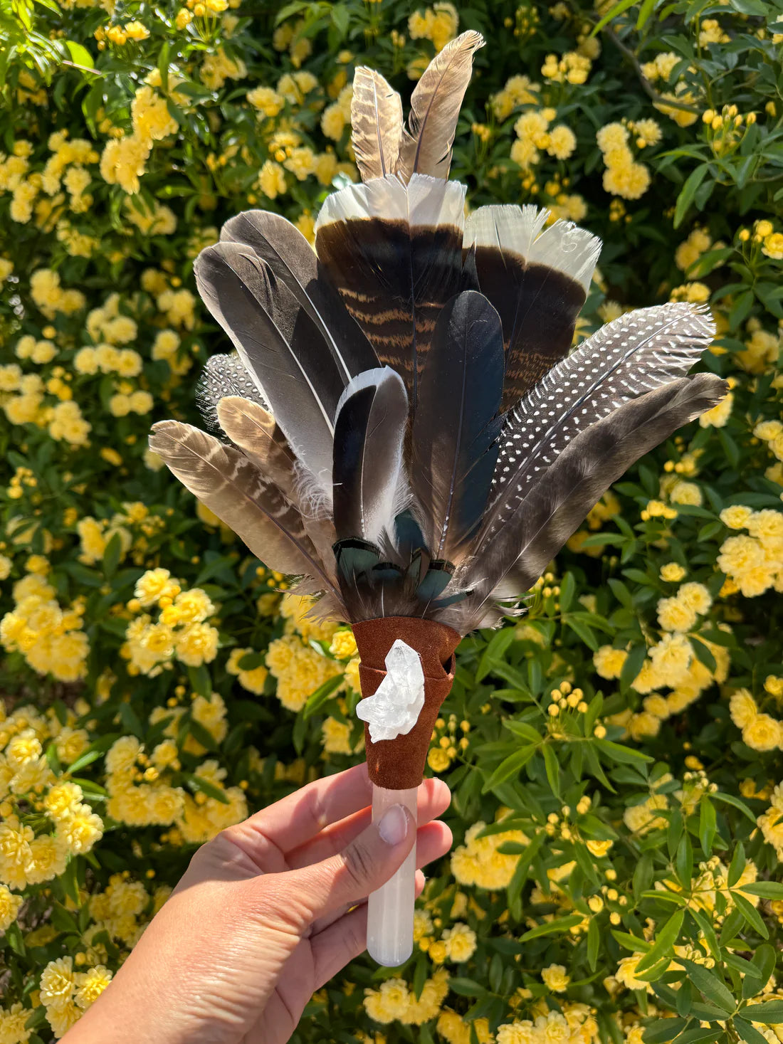 This enchanted feather wand contains a mixture of turkey, duck, and pheasant feathers. The handle is made from selenite and adorned with a stunning quartz or similar crystal, providing powerful clearing and cleansing properties. Incorporate this mystical tool into your rituals to focus, activate, and purify your desired energy.